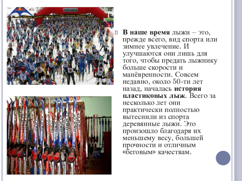 зимнее увлечение. И улучшаются они лишь для того, чтобы предать лыжнику больше скорости и манёвренности. Совсем недавно, около 50-ти лет назад, началась история пластиковых лыж. Всего за несколько лет они практически полностью вытеснили из спорта деревянные лыжи. Это произошло благодаря их меньшему весу, большей прочности и отличным «беговым» качествам.