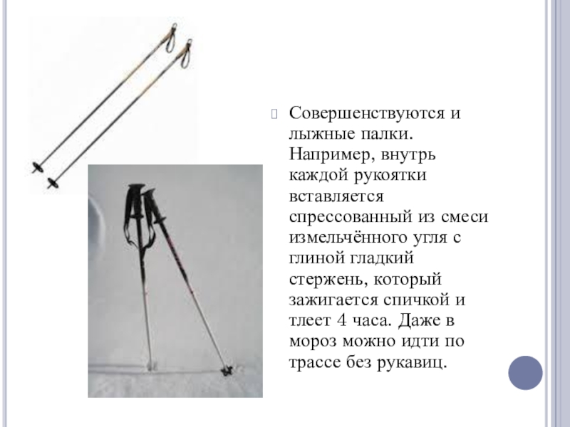 Слайд 8Совершенствуются и лыжные палки. Например, внутрь каждой рукоятки вставляется спрессованный из