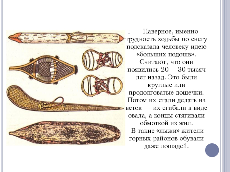 Наверное, именно трудность ходьбы по снегу подсказала человеку идею «больших подошв». Считают, что они появились 20— 30 тысяч лет назад. Это были круглые или продолговатые дощечки. Потом их стали делать из веток — их