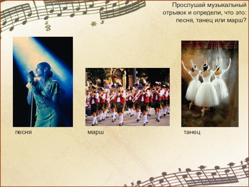 Прослушай музыкальный отрывок и определи, что это: песня, танец или марш?