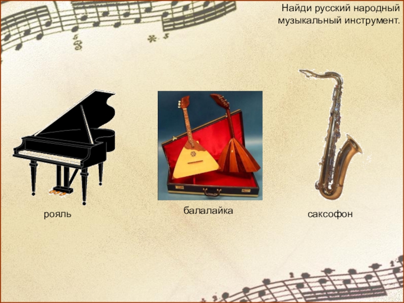 Найди русский народный музыкальный инструмент.рояльбалалайкасаксофон