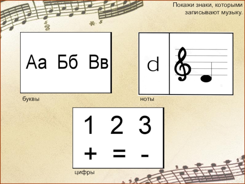 Покажи знаки, которыми записывают музыку.буквыцифрыноты