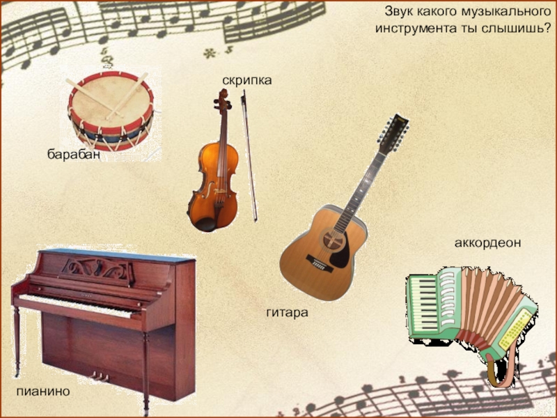 Звук какого музыкального инструмента ты слышишь?барабанскрипкагитарааккордеонпианино