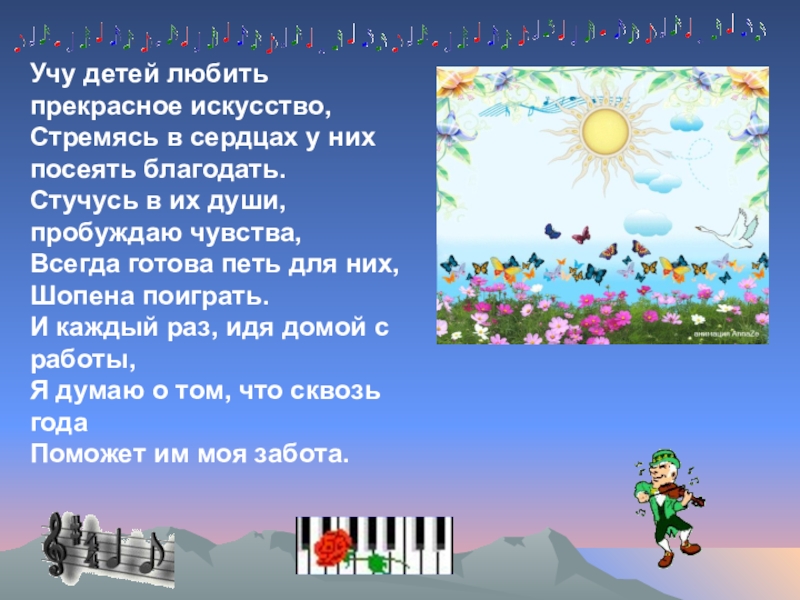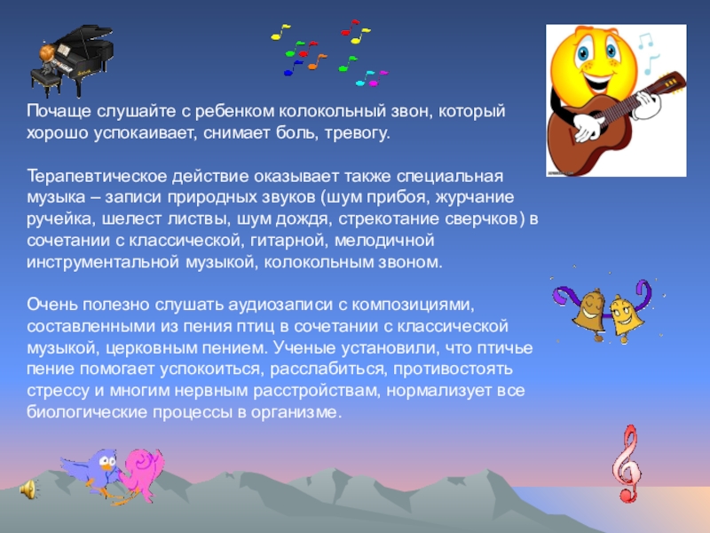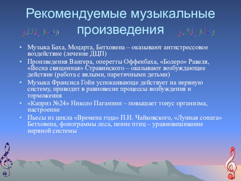 1.Одной из оздоровительно-профилактических задач коллектива ДОУ должно стать создание оптимальных условий в период пребывания детей в их втором доме — детском саду. По утрам, в момент приема детей в детский сад, необходимо включать записи классических и современных произведений с соответствующим мажорным, солнечным звучанием. В этом случае музыка будет выступать в качестве терапевтического средства, корректируя психофизическое состояние детей.