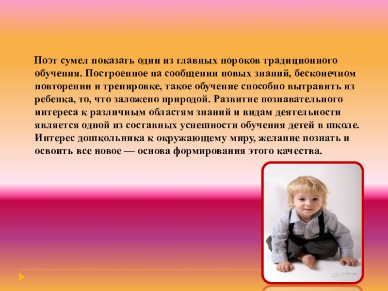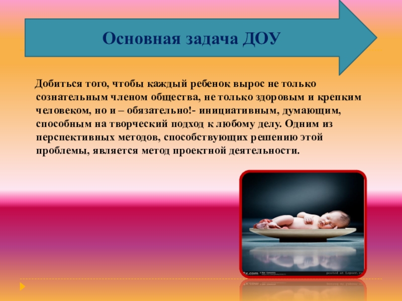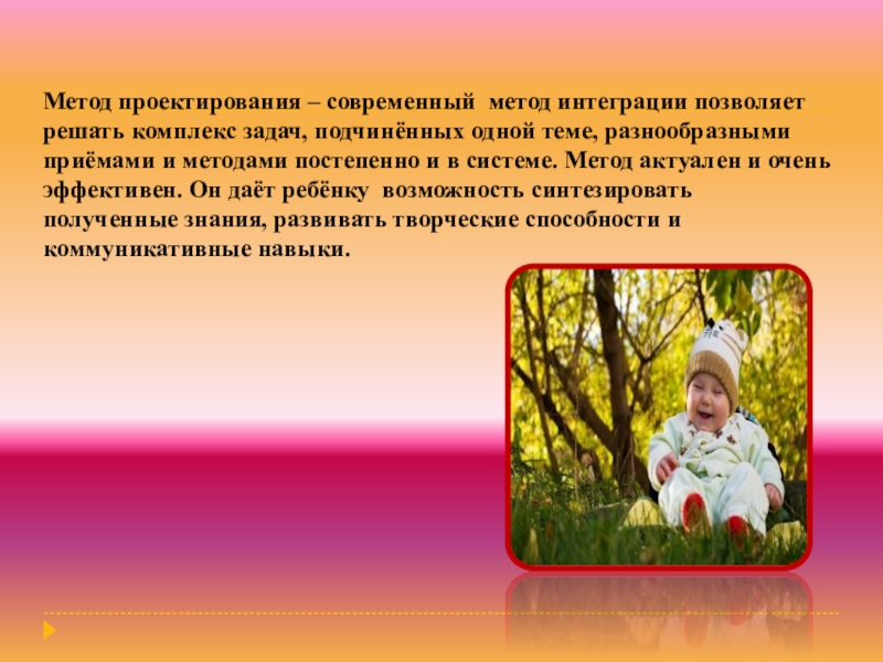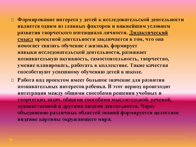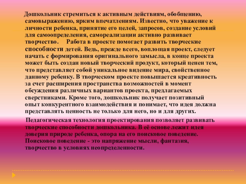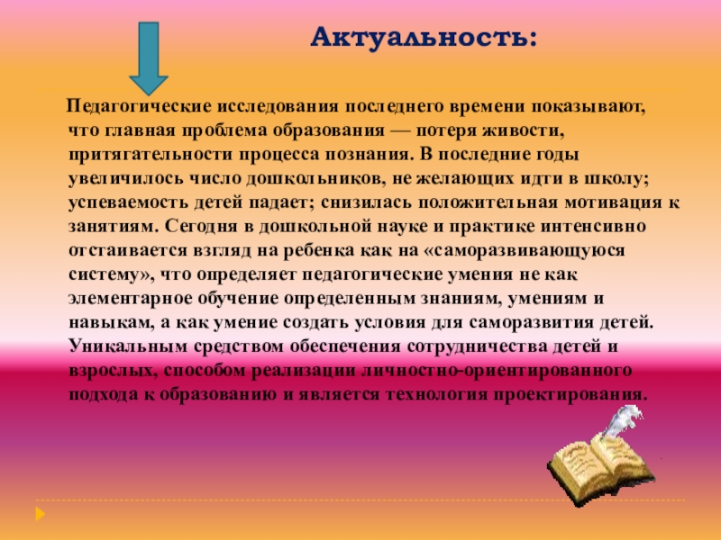Педагогические исследования последнего времени показывают, что главная проблема образования — потеря живости, притягательности процесса познания. В последние годы увеличилось число дошкольников, не желающих идти в школу; успеваемость детей падает; снизилась положительная мотивация к занятиям. Сегодня в дошкольной науке и практике интенсивно отстаивается взгляд на ребенка как на «саморазвивающуюся систему», что определяет педагогические умения не как элементарное обучение определенным знаниям, умениям и навыкам, а как умение создать условия для саморазвития детей. Уникальным средством обеспечения сотрудничества детей и взрослых, способом реализации личностно-ориентированного подхода к образованию и является технология проектирования.