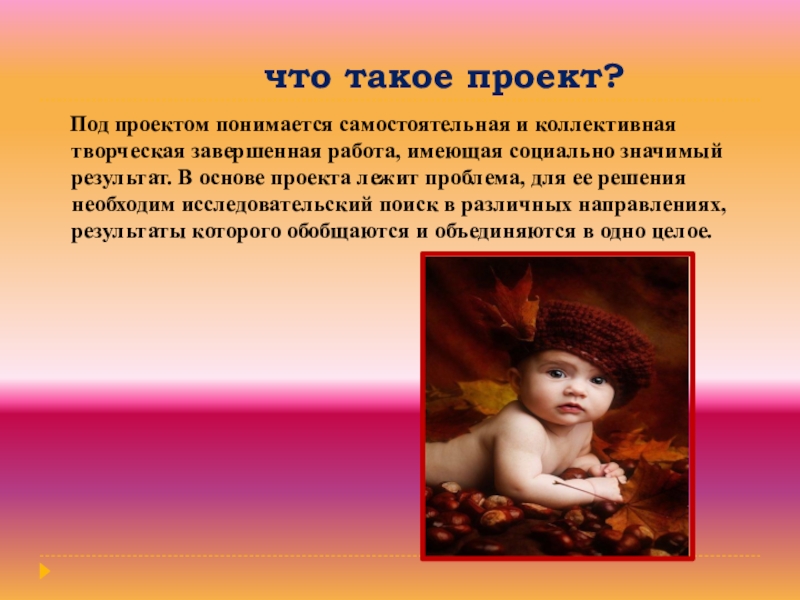 Под проектом понимается самостоятельная и коллективная творческая завершенная работа, имеющая социально значимый результат. В основе проекта лежит проблема, для ее решения необходим исследовательский поиск в различных направлениях, результаты которого обобщаются и объединяются в одно целое.