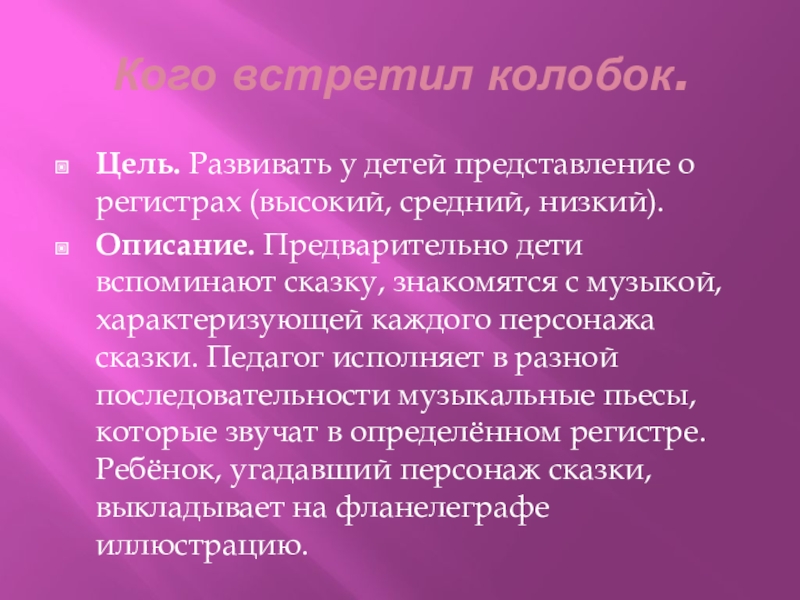 Описание. Предварительно дети вспоминают сказку, знакомятся с музыкой, характеризующей каждого персонажа сказки. Педагог исполняет в разной последовательности музыкальные пьесы, которые звучат в определённом регистре. Ребёнок, угадавший персонаж сказки, выкладывает на фланелеграфе иллюстрацию.