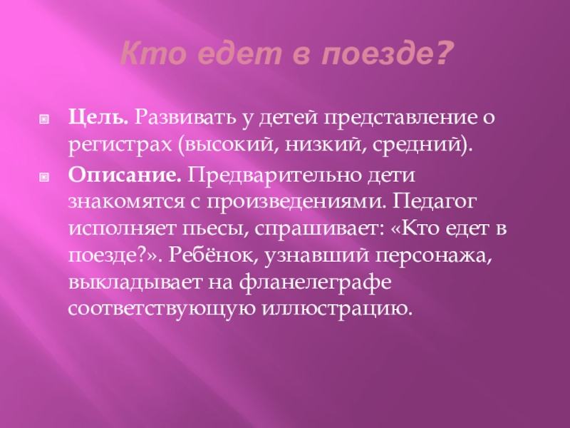 Описание. Предварительно дети знакомятся с произведениями. Педагог исполняет пьесы, спрашивает: «Кто едет в поезде?». Ребёнок, узнавший персонажа, выкладывает на фланелеграфе соответствующую иллюстрацию.