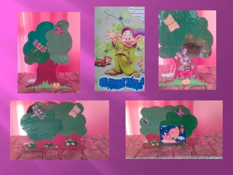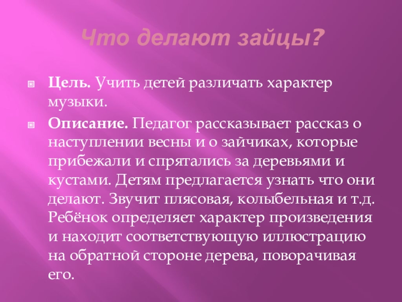о наступлении весны и о зайчиках, которые прибежали и спрятались за деревьями и кустами. Детям предлагается узнать что они делают. Звучит плясовая, колыбельная и т.д. Ребёнок определяет характер произведения и находит соответствующую иллюстрацию на обратной стороне дерева, поворачивая его.