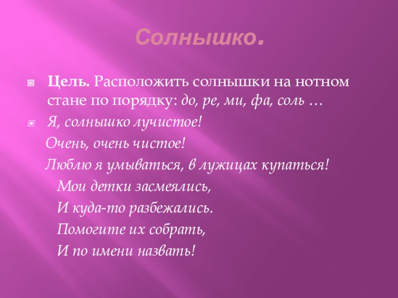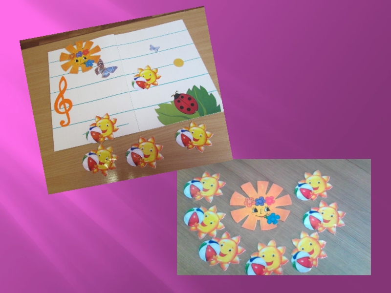 Цель. Расположить солнышки на нотном стане по порядку: до, ре, ми,