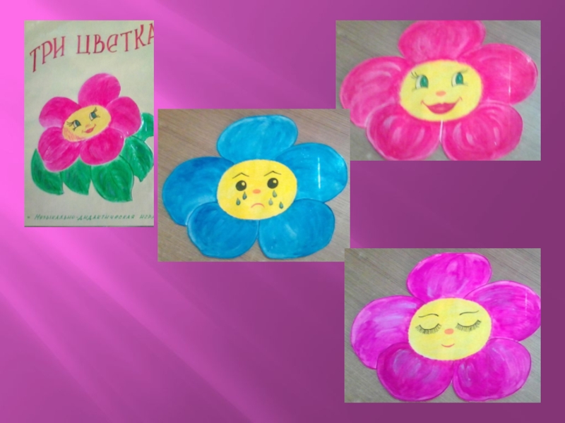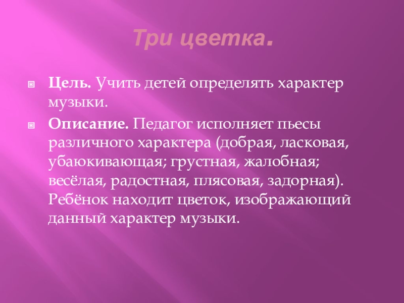 характера (добрая, ласковая, убаюкивающая; грустная, жалобная; весёлая, радостная, плясовая, задорная). Ребёнок находит цветок, изображающий данный характер музыки.
