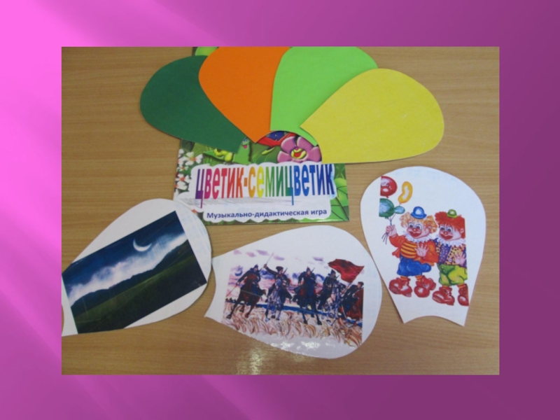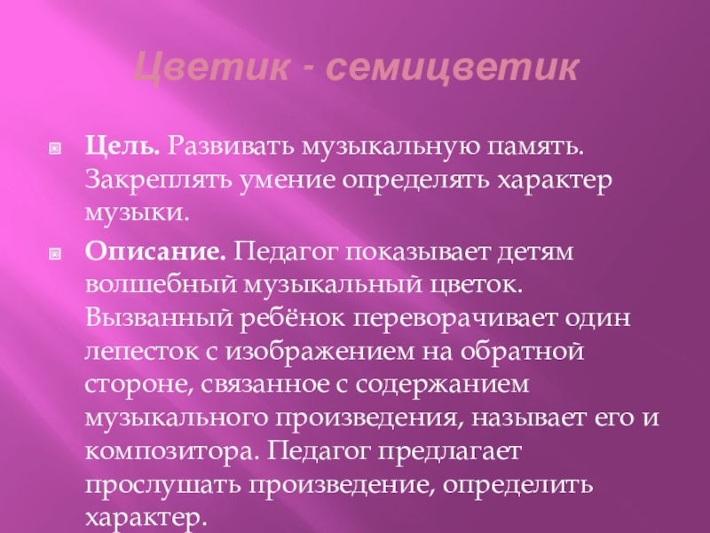 Педагог показывает детям волшебный музыкальный цветок. Вызванный ребёнок переворачивает один лепесток с изображением на обратной стороне, связанное с содержанием музыкального произведения, называет его и композитора. Педагог предлагает прослушать произведение, определить характер.