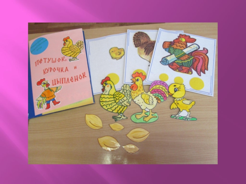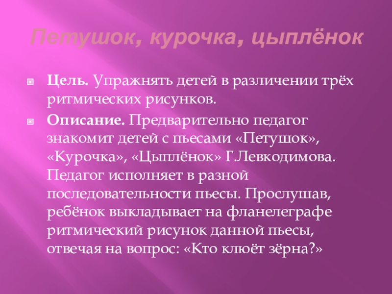 педагог знакомит детей с пьесами «Петушок», «Курочка», «Цыплёнок» Г.Левкодимова. Педагог исполняет в разной последовательности пьесы. Прослушав, ребёнок выкладывает на фланелеграфе ритмический рисунок данной пьесы, отвечая на вопрос: «Кто клюёт зёрна?»