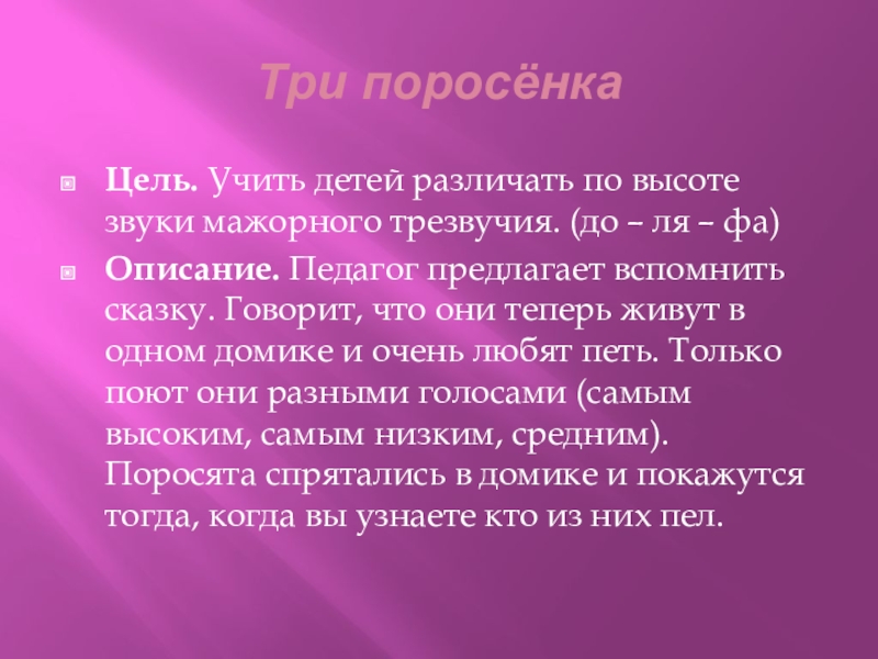 Описание. Педагог предлагает вспомнить сказку. Говорит, что они теперь живут в одном домике и очень любят петь. Только поют они разными голосами (самым высоким, самым низким, средним). Поросята спрятались в домике и покажутся тогда, когда вы узнаете кто из них пел.
