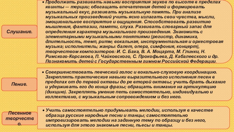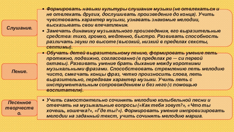 петь без напряжения, плавно, легким звуком; произносить отчетливо слова, своевременно начинать и заканчивать песню; петь в сопровождении музыкального инструмента