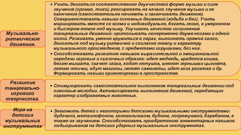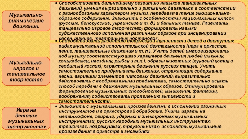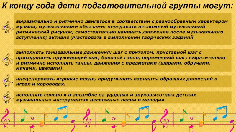 выразительно и ритмично двигаться в соответствии с разнообразным характером музыки, музыкальными образами; передавать несложный музыкальный ритмический рисунок; самостоятельно начинать движение после музыкального вступления; активно участвовать в выполнении творческих заданий