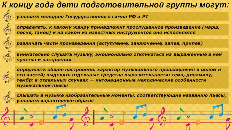 определять общее настроение, характер музыкального произведения в целом и его частей; выделять отдельные средства выразительности: темп, динамику, тембр; в отдельных случаях — интонационные мелодические особенности музыкальной пьесы