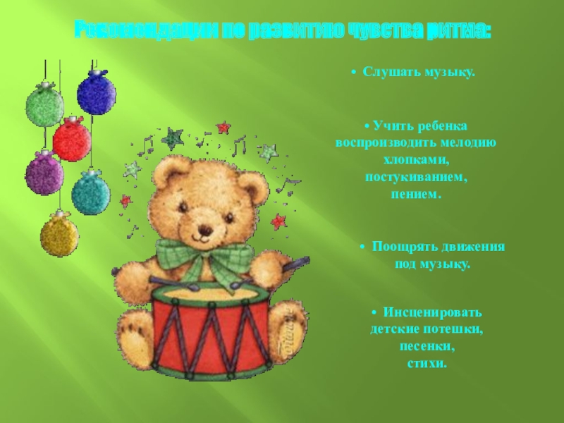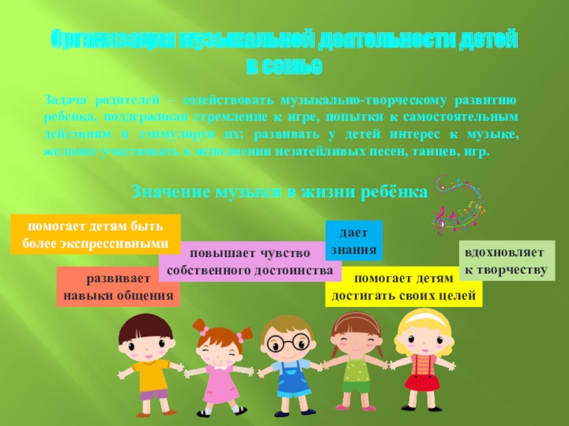 Задача родителей – содействовать музыкально-творческому развитию ребенка, поддерживая стремление к игре, попытки к самостоятельным действиям и стимулируя их; развивать у детей интерес к музыке, желание участвовать в исполнении незатейливых песен, танцев, игр.