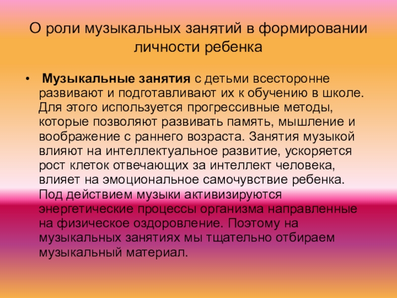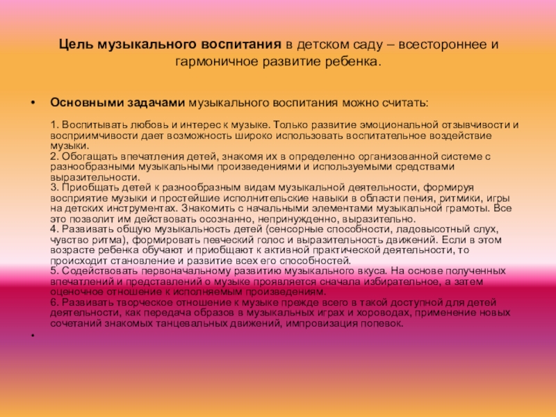 1. Воспитывать любовь и интерес к музыке. Только развитие эмоциональной отзывчивости и восприимчивости дает возможность широко использовать воспитательное воздействие музыки.
