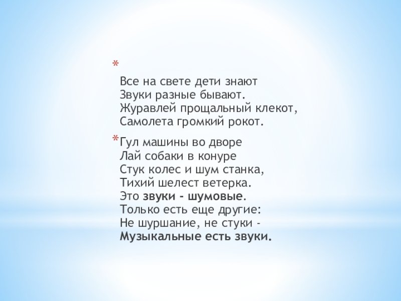 Все на свете дети знают Звуки разные бывают. Журавлей прощальный клекот, Самолета громкий рокот. Гул машины во дворе Лай собаки в конуре Стук колес и шум станка, Тихий шелест ветерка. Это звуки -