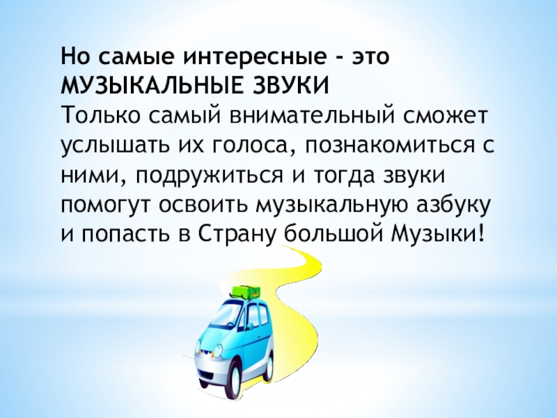 их голоса, познакомиться с ними, подружиться и тогда звуки помогут освоить музыкальную азбуку и попасть в Страну большой Музыки!