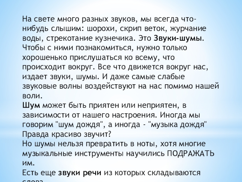веток, журчание воды, стрекотание кузнечика. Это Звуки-шумы. Чтобы с ними познакомиться, нужно только хорошенько прислушаться ко всему, что происходит вокруг. Все что движется вокруг нас, издает звуки, шумы. И даже самые слабые звуковые волны воздействуют на нас помимо нашей воли. Шум может быть приятен или неприятен, в зависимости от нашего настроения. Иногда мы говорим "шум дождя", а иногда - "музыка дождя" Правда красиво звучит? Но шумы нельзя превратить в ноты, хотя многие музыкальные инструменты научились ПОДРАЖАТЬ им.