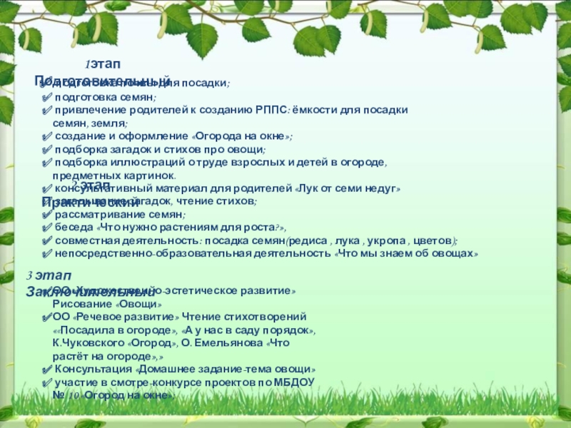участие в смотре-конкурсе проектов по МБДОУ № 10 «Огород на окне»;