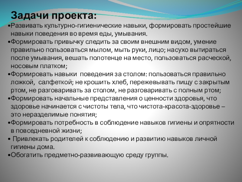 Цель проекта: Создание условий для формирования культурно-гигиенических навыков и навыков самообслуживания у детей младшего дошкольного возраста.