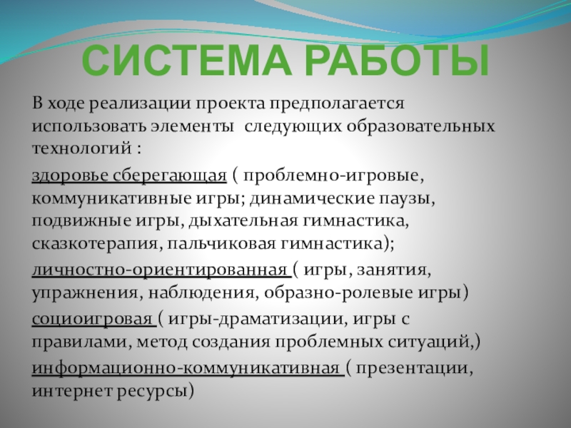 здоровье сберегающая ( проблемно-игровые, коммуникативные игры; динамические паузы, подвижные игры, дыхательная гимнастика, сказкотерапия, пальчиковая гимнастика);