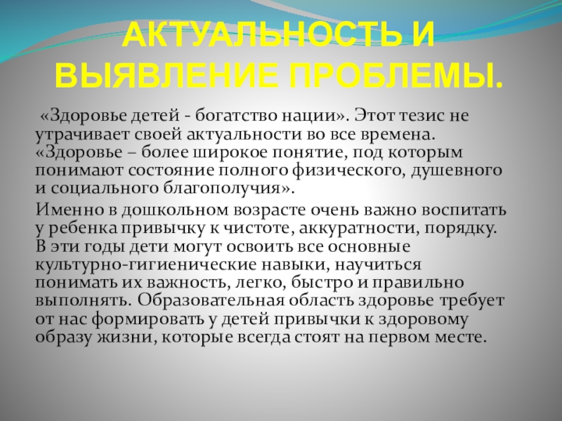 Именно в дошкольном возрасте очень важно воспитать у ребенка привычку к чистоте, аккуратности, порядку. В эти годы дети могут освоить все основные культурно-гигиенические навыки, научиться понимать их важность, легко, быстро и правильно выполнять. Образовательная область здоровье требует от нас формировать у детей привычки к здоровому образу жизни, которые всегда стоят на первом месте.