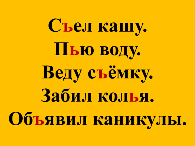 Слайд 10Сел кашу. Пю воду. Веду сёмку. Забил коля. Обявил каникулы.