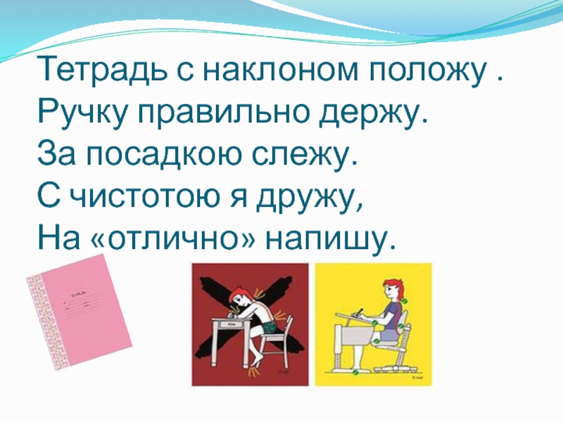 Слайд 8Тетрадь с наклоном положу . Ручку правильно держу. За посадкою слежу. С чистотою я