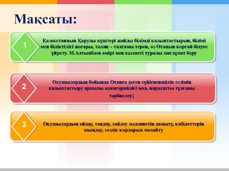 Оқушылардың бойында Отанға деген сүйіспеншілік сезімін қалыптастыру арқылы адамгершілігі мол, парасатты тұлғаны тәрбиелеу;