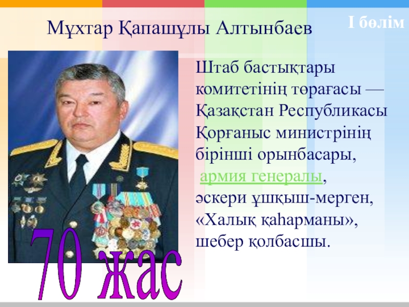 Қазақстанның Қарулы күштері жайлы білімді қалыптастырып, білімі мен біліктілігі жоғары, талап – талғамы терең, өз Отанын қорғай білуге үйрету. М.Алтынбаев өмірі мен қызметі туралы мағлұмат беру