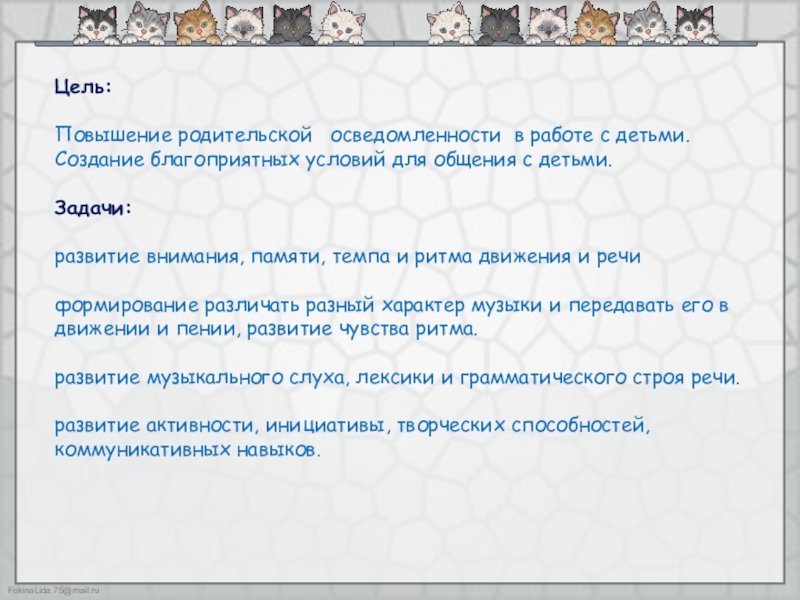 Слайд 3Цель: Повышение родительской осведомленности в работе с детьми. Создание благоприятных условий для
