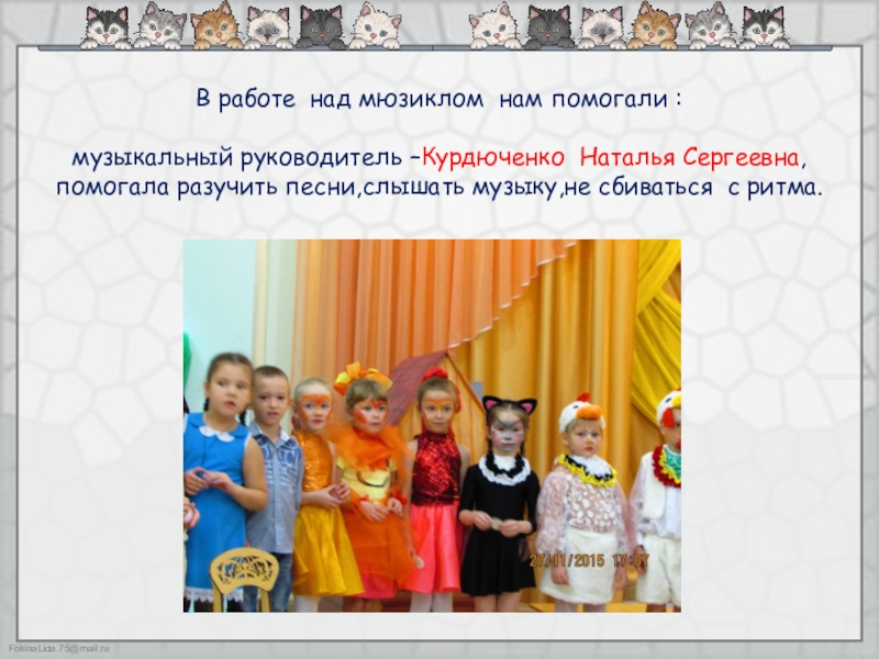 Слайд 4В работе над мюзиклом нам помогали : музыкальный руководитель –Курдюченко Наталья Сергеевна,помогала