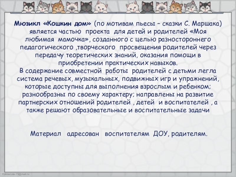 Презентация, доклад на тему Мюзикл Кошкин дом (Итоговое мероприятие проекта Моя мама лучше всех