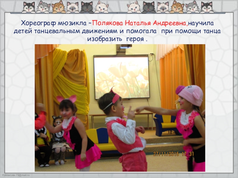 Слайд 7Хореограф мюзикла –Полякова Наталья Андреевна,научила детей танцевальным движениям и помогала при