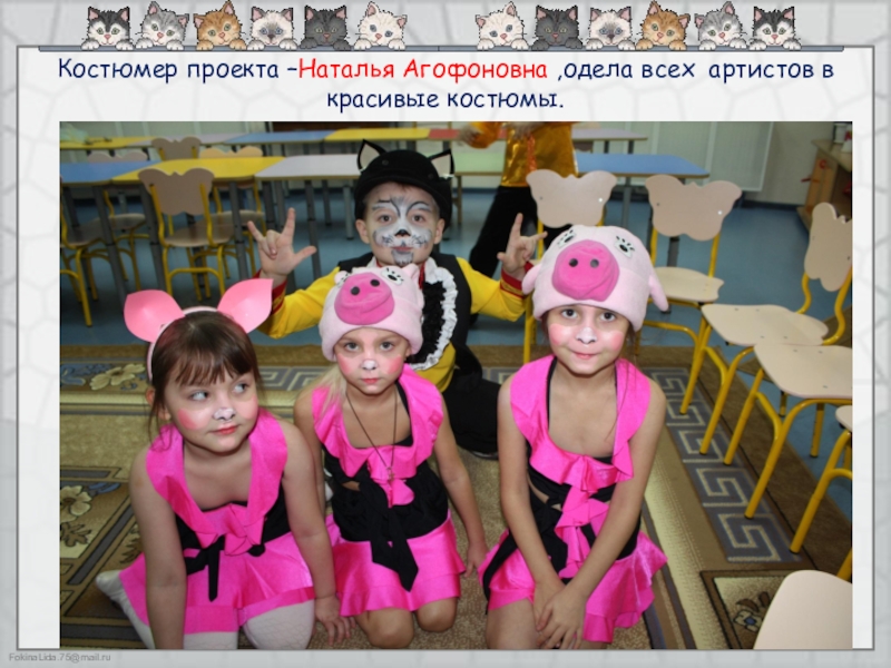 Костюмер проекта –Наталья Агофоновна ,одела всех артистов в красивые костюмы.