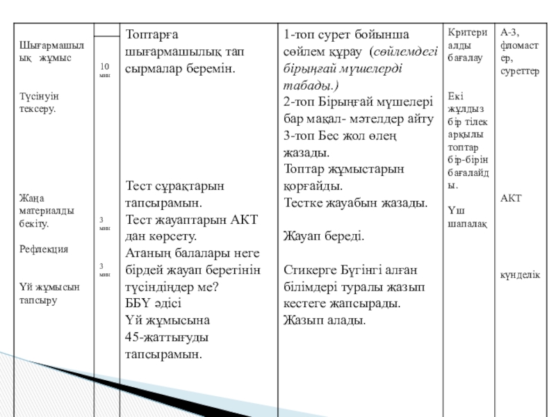 Сөйлемнің бірыңғай мүшелерін біледі. Топта жұмыс жасай біледі. Сыни ойлай отырып шығармашылық тапсырмаларды орындайды. Өзіне деген сенімділігі артыып, өзін-өзі бағалай біледі.