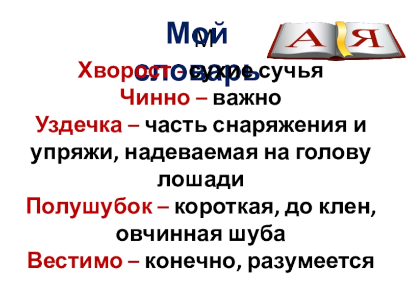 М Мой словарьХворост - сухие сучьяЧинно – важноУздечка – часть снаряжения и упряжи, надеваемая на голову лошадиПолушубок
