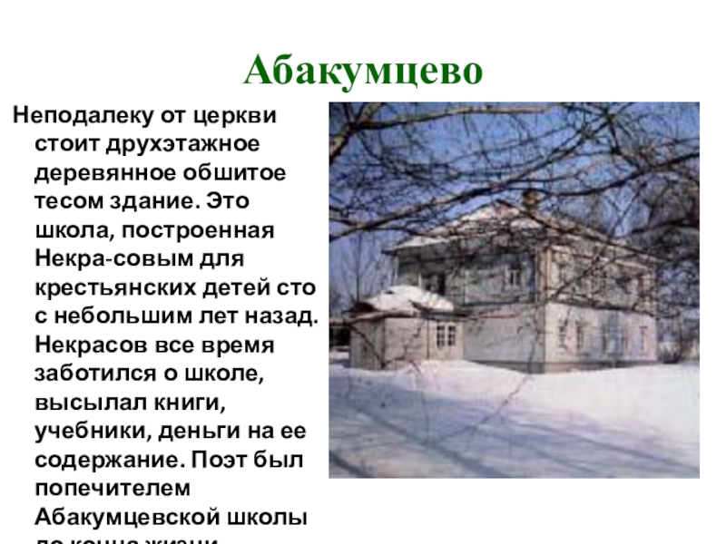 Абакумцево Неподалеку от церкви стоит друхэтажное деревянное обшитое тесом здание. Это школа, построенная Некра-совым для крестьянских детей