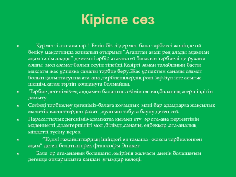 “Күллі ғажайыптардың ішіндегі ең тамаша –жақсы тәрбиеленген адам” деген болатын грек философы Эпикет.