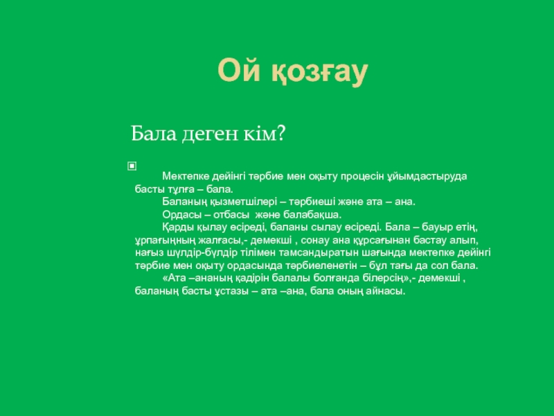 Ой қозғау Бала деген кім? Мектепке дейінгі тәрбие мен оқыту процесін ұйымдастыруда басты тұлға – бала.