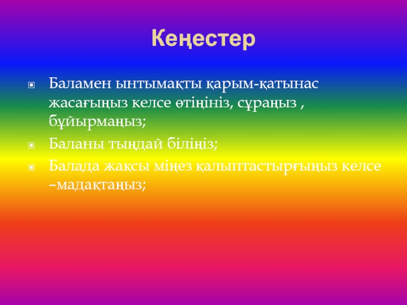 Кеңестер Баламен ынтымақты қарым-қатынас жасағыңыз келсе өтіңініз, сұраңыз , бұйырмаңыз;Баланы тыңдай біліңіз;Балада жақсы міңез қалыптастырғыңыз келсе –мадақтаңыз;