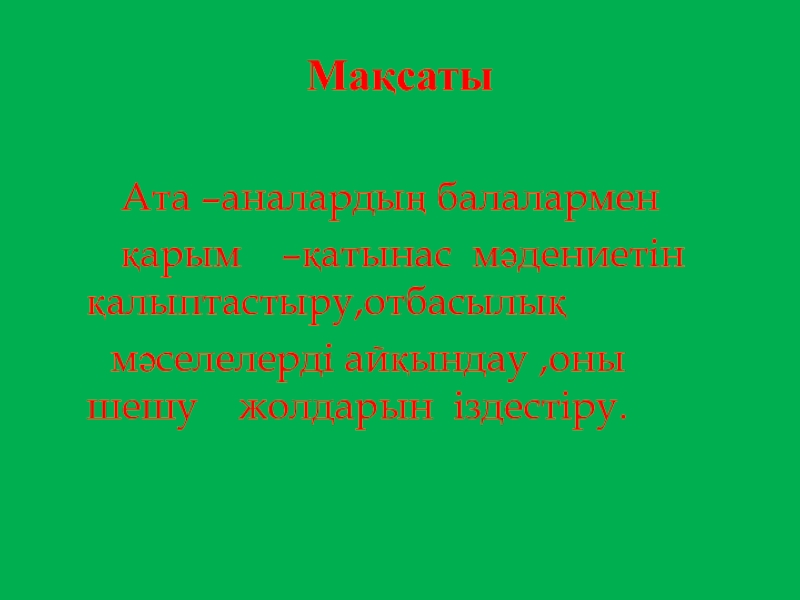Мақсаты Ата –аналардың балалармен қарым –қатынас мәдениетін қалыптастыру,отбасылық мәселелерді айқындау ,оны шешу жолдарын іздестіру.