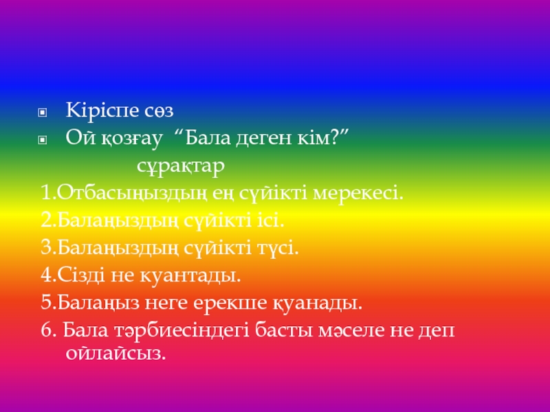 Кіріспе сөз Ой қозғау “Бала деген кім?”         сұрақтар 1.Отбасыңыздың