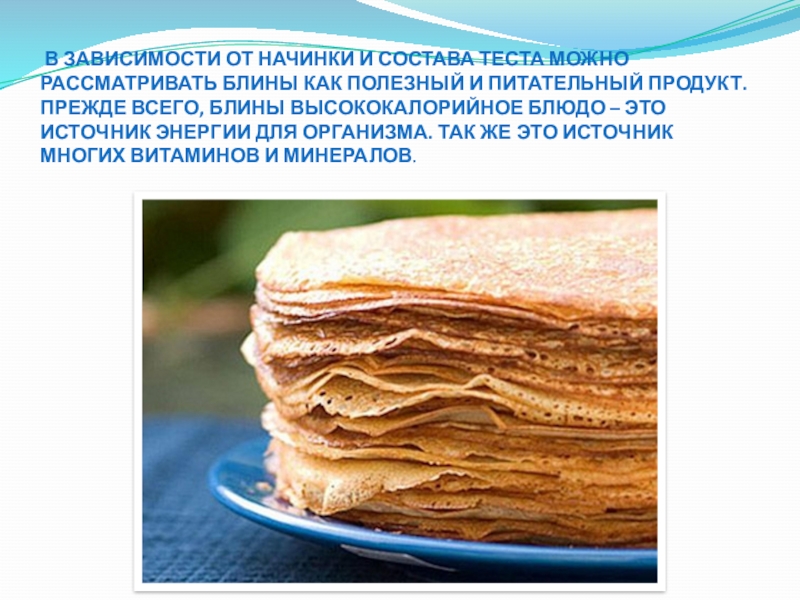 Слайд 3 В зависимости от начинки и состава теста можно рассматривать блины