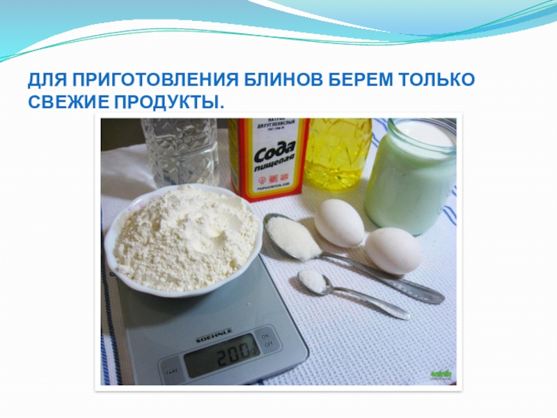 Слайд 4Для приготовления блинов берем только свежие продукты.