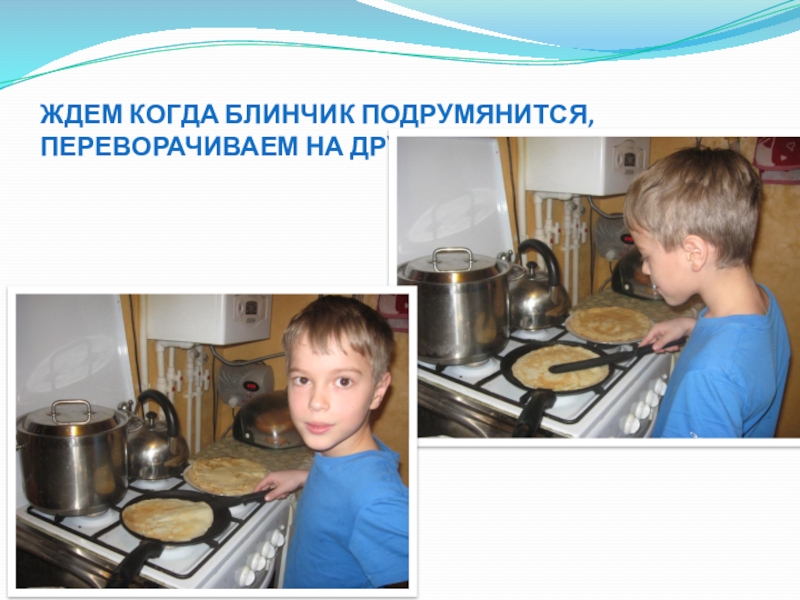 Слайд 9Ждем когда блинчик подрумянится, переворачиваем на другую сторону.